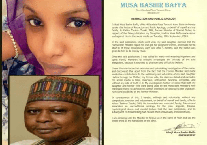 Also, the lady’s father, Musa Bashir Baffa, has written a formal letter of apology to Turaki, pleading forgiveness for his family while also accusing his daughter, Hadiza Baffa and her mother, who he described in his letter as his former wife, of being used by the former Minister’s political adversaries to tarnish his image.