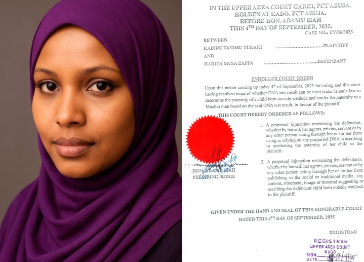 The court then ordered as follows: 1. “A perpetual injunction restraining the defendant ( Baffa), whether by herself, her agents, privies, servants or by any other person acting through her or for her from using or relying on any purported DNA in ascribing or attributing the paternity of her child to the plaintiff (Turaki). 2. “A perpetual injunction restraining the defendant (Baffa), whether by herself, her agents, privies, servants or by any other person acting through her or for her publishing in the social media or traditional media, any content, statement, image or material suggesting or ascribing the defendant’s child born outside wedlock to the plaintiff.”